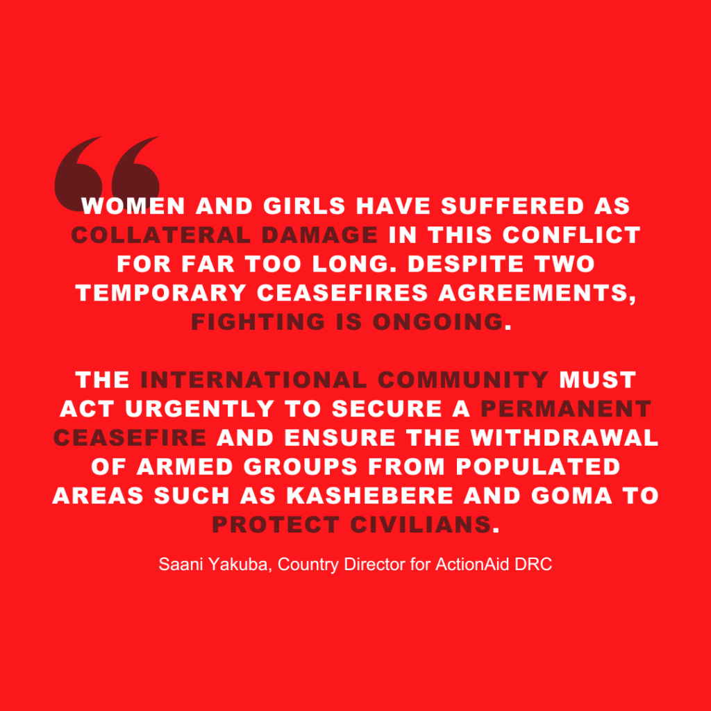 Saani Yakuba, Country Director for ActionAid DRC said: “Women and girls have suffered as collateral damage in this conflict for far too long. Despite two temporary ceasefires agreements, fighting is ongoing. The international community must act urgently to secure a permanent ceasefire and ensure the withdrawal of armed groups from populated areas such as Kashebere and Goma to protect civilians.”