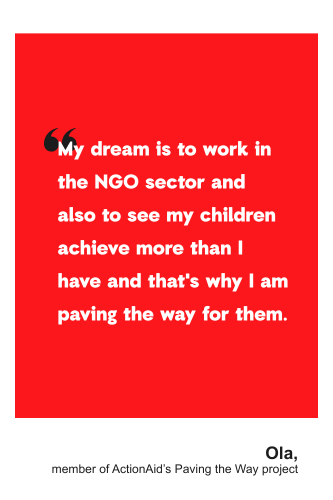Quote from Ola, a member of ActionAid’s Paving the Way project: “My dream is to work in the NGO sector and also to see my children achieve more than I have and that’s why I am paving the way for them.”