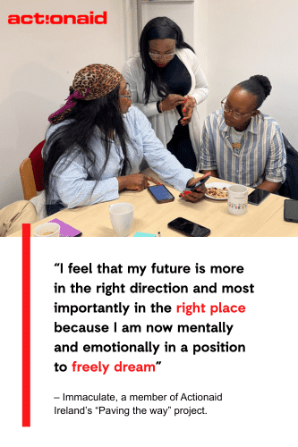 Quote from Immaculate, a member of ActionAid Ireland’s “Paving the Way” project: “I feel that my future is more in the right direction and most importantly in the right place because I am now mentally and emotionally in a position to freely dream.”